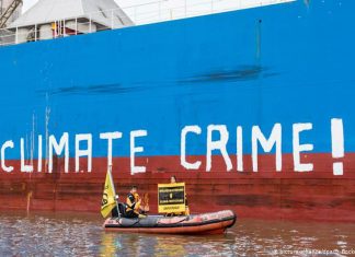Membros do Greenpeace escrevem mensagem em cargueiro com soja vinda do Brasil e alertam para destruição de florestas no país. Grupo exige que governo alemão proíba importação de commodity produzida em regiões desmatadas.
